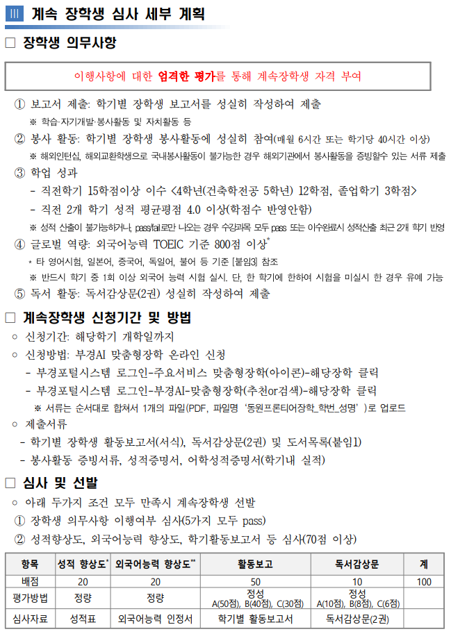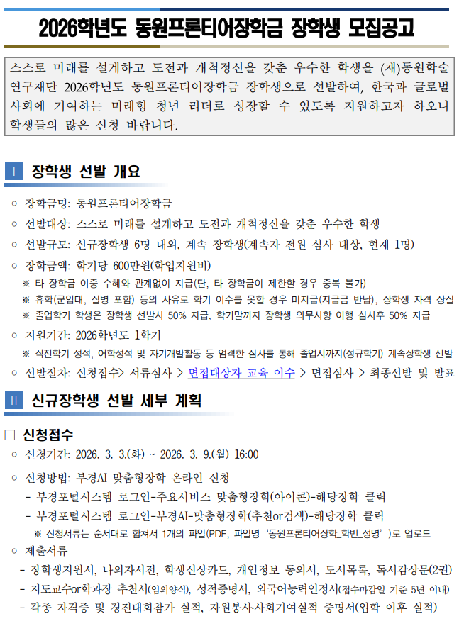 | 첨부파일 | (붙임2) [모집 공고] 동원프론티어장학금 장학생 모집공고.pdf (붙임3) 장학생 지원서 등 작성서식_2026.hwpx (붙임1) 홍보 포스터.png | ||